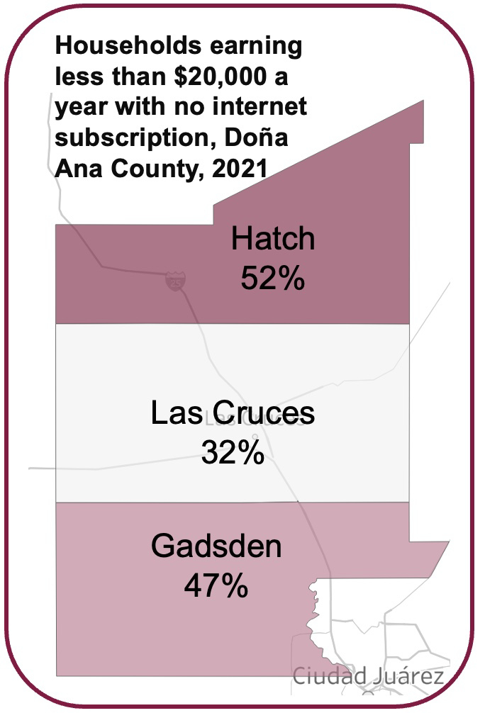 According to the most recent data from the US Census Bureau, the digital divide is strongly tied to families' socioeconomic composition, geography, and race and ethnicity. Families earning less than $20,000 annually, those living in rural areas, and students of color are the most impacted. Thirty-two percent of households residing within Las Cruces Public School District boundaries and earning less than $20,000 a year are without internet access, compared to only 5% of households earning over $75,000 yearly. (3) That number only increases when looking at Doña Ana's more rural districts. Within Gadsden Independent School District and Hatch Valley Public School District boundaries, approximately half of households earning less than $20,000 a year lack broadband connectivity; 47% and 52%, respectively. |