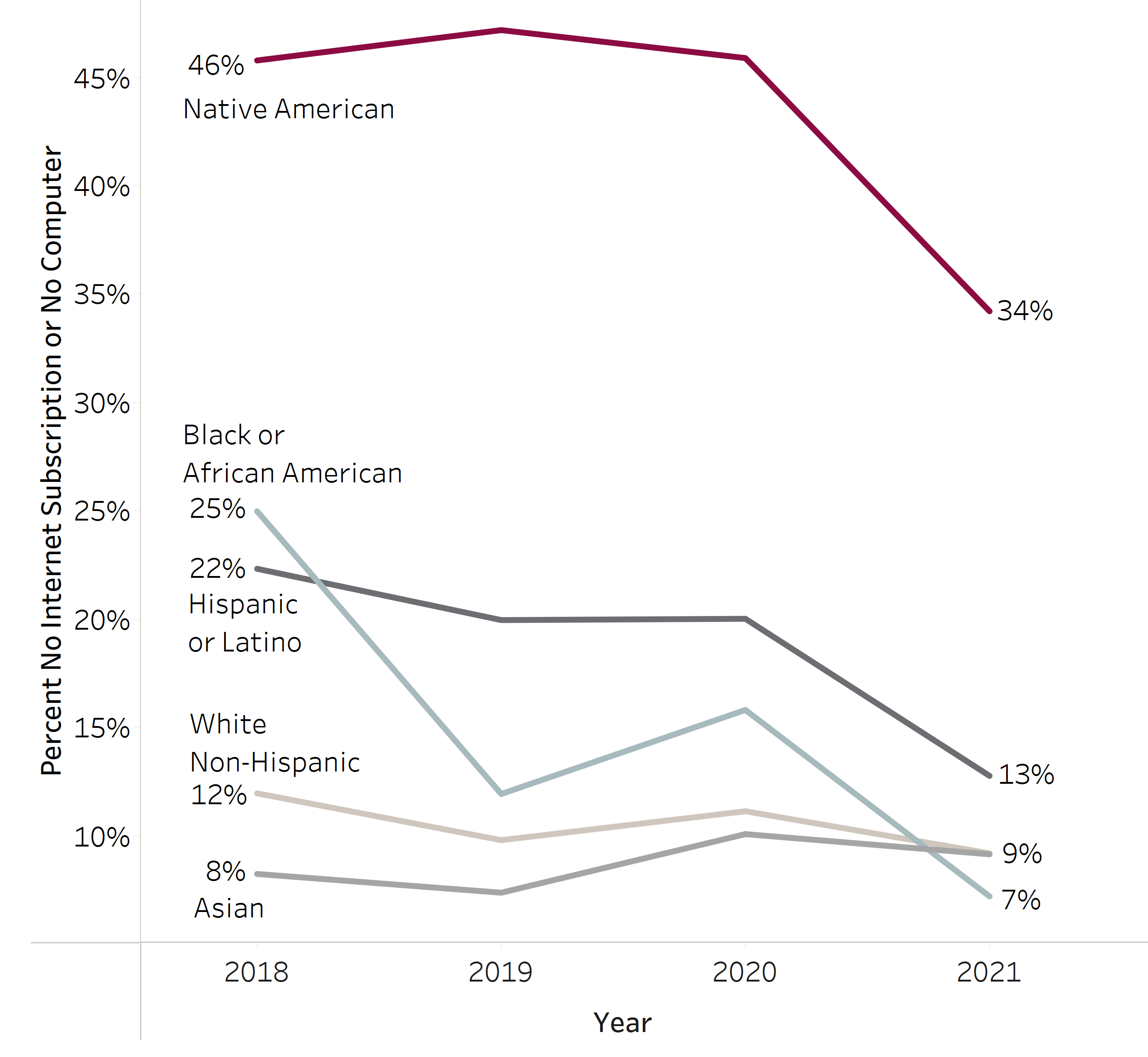 The digital divide also impacts certain racial groups more than others. In New Mexico, Native American households are approximately three times as likely as all other racial and ethnic groups to lack a computer or internet access. (4) However, New Mexico has experienced some progress since 2018. According to the most recent data from the US Census Bureau, in 2018, nearly half of Native American households (46%) lacked a computer or internet access, compared to 34% in 2021. Similarly, trends show that the percentage of access is slowly decreasing for other racial and ethnic groups. Still, our state has a long way to go to close this gap. |